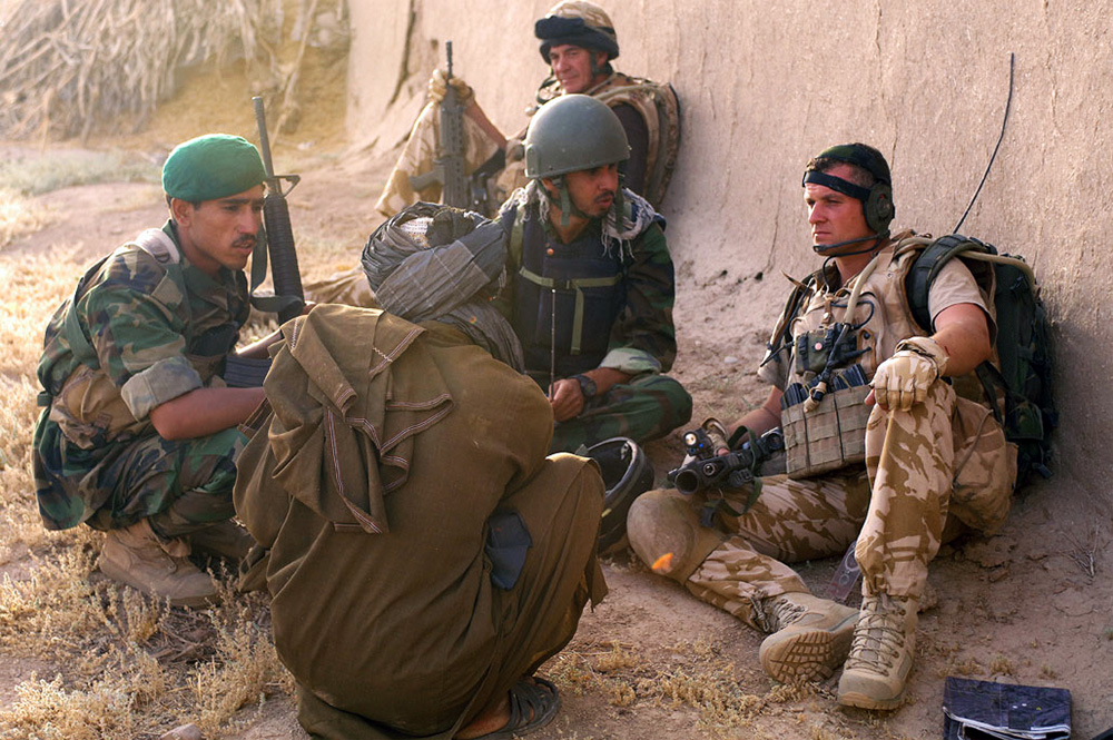 Ein britischer Soldat kommuniziert 2008 mit einem Einheimischen über einen Dolmetscher und einen Soldaten der Afghanischen Nationalarmee. Foto von wikipedia.org