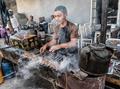Danach fuhren wir in die Stadt Tschust, auf den Basar der traditionellen Tschuster Messer. Dort fand Anzor Schmiedewerkstätten mit brennenden Schmiedefeuern.
