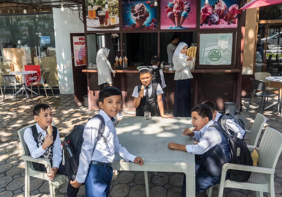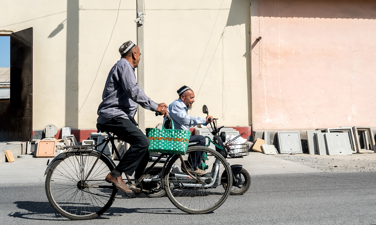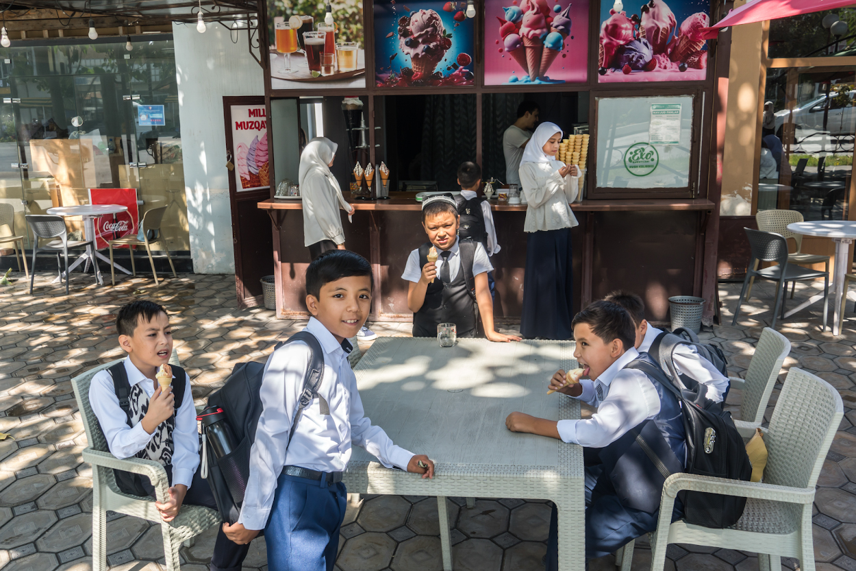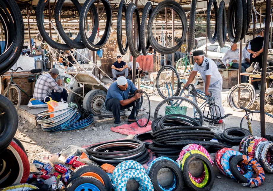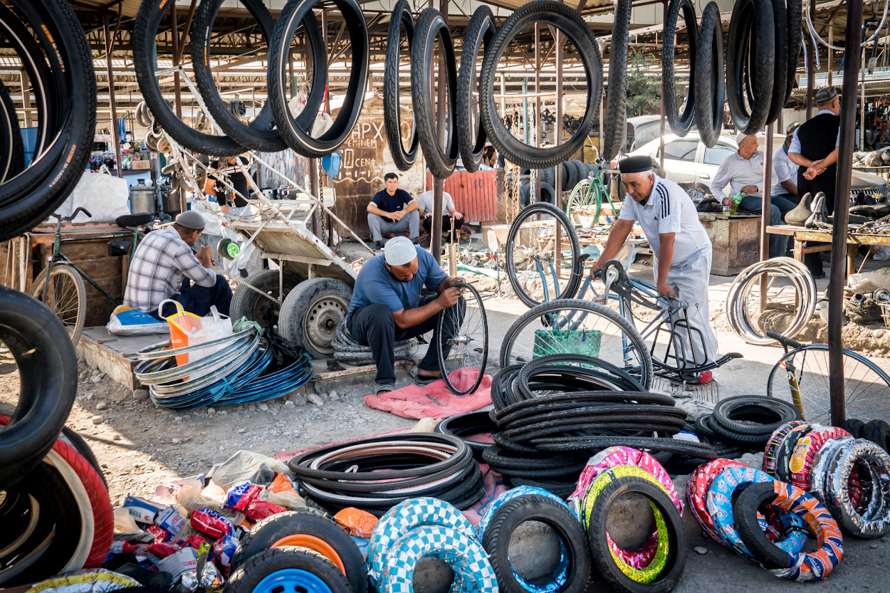 Wir aßen mit Vergnügen Eis zusammen mit einheimischen Schulkindern. Dabei fiel uns ein auffälliges Merkmal des lokalen Lebens auf: Im Straßenverkehr von Margilan spielt der zweirädrige Verkehr eine sehr große Rolle. Gemeint sind jedoch nicht Motorräder, sondern vor allem Fahrräder sowie Mopeds, Motorroller und Scooter. Eine naheliegende Erklärung dafür liegt im absolut flachen Relief des zentralen Teils des Fergana-Tals, das den Zweiradverkehr zu einem praktischen Fortbewegungs- und Transportmittel macht. Im Gedränge der lokalen Basare und der engen Gassen rundherum wimmeln Fahrräder und Scooter flink umher wie kleine Fische in einer reißenden Strömung.