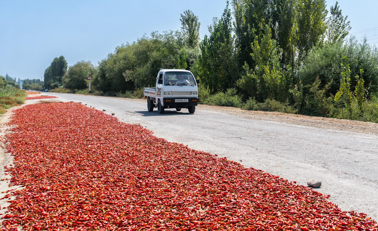 Um die monotone Fahrt mit 70 km/h etwas aufzulockern, hielten wir so oft wie möglich am Straßenrand an – auch für eine Zigarette. Zum Beispiel dort, wo Dorfbewohner auf weniger belebten Abschnitten der Trasse die ersten Früchte ihrer Ernte zum Trocknen ausgebreitet hatten: abgerissene Maiskolben oder rote, scharfe Kalampir-Paprika. Hochkünstlerische Fotos gelangen mir persönlich zwar nicht, doch ein interessantes Detail des Alltagslebens wurde auf diese Weise dennoch festgehalten.